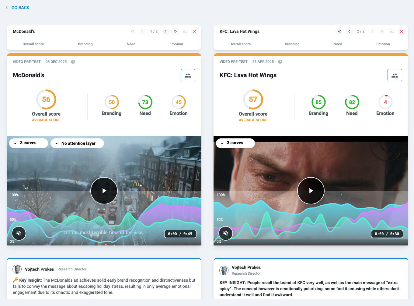 - Quick Anchors: Use the labels (Overall score/Ad impact, Branding, Need, Emotion) to jump instantly to that specific section within a single report.