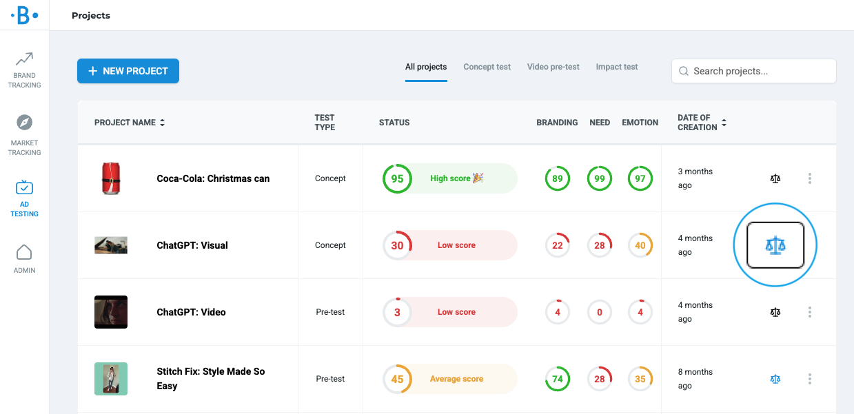 The Project Comparison page allows you to display individual ad testing reports next to each other. This view has no limitations on the number of reports, making it easy to contrast performance, identify trends, and analyze different creative executions in one place.